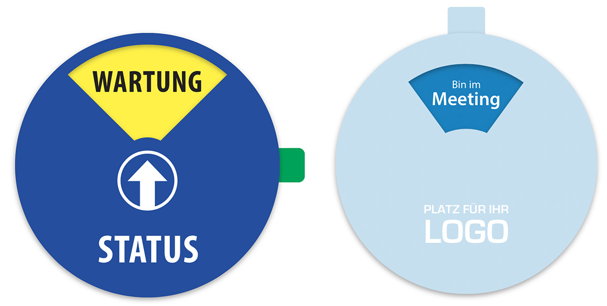 Die Status-Drehscheiben können mit individuellem Aufdruck wie Logo oder anderen Hinweisen versehen werden.